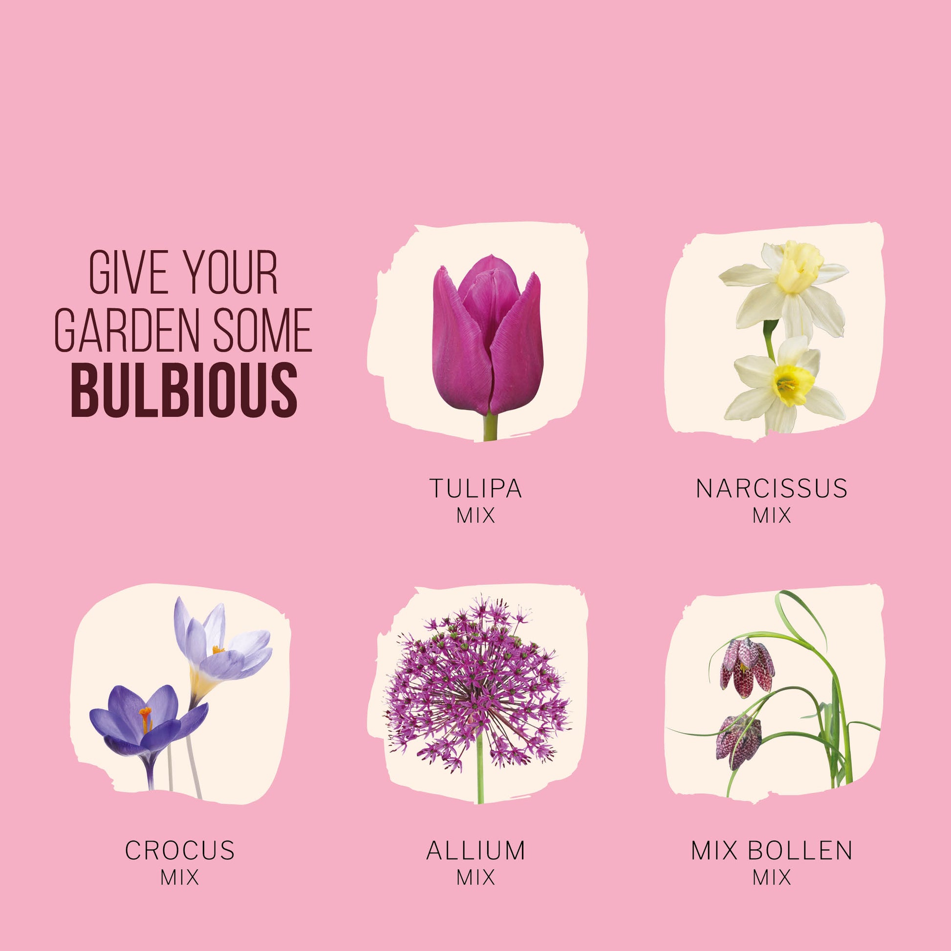 • 50 vrolijke voorjaarsbloembollen zoals tulpen, narcissen, crocussen en alliums.
